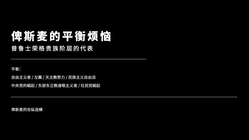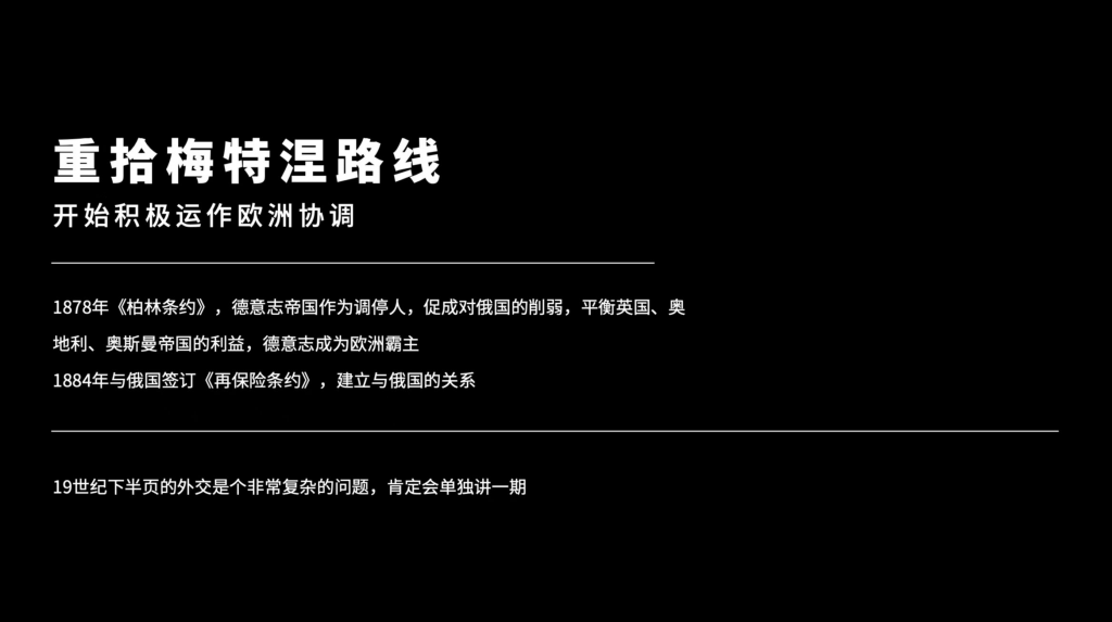 因为俾斯麦本身并没有强烈的扩张主义的冲动,我们说,当时打这三仗主要是普鲁士plus,这普鲁士能够获得一定的实力,俾斯麦并不想去统治周围的国家。因此,很快他就开始重拾梅特尼的路线,来运作欧洲协调。现在打破欧洲协调的主要就是俄国在克里米亚战争,俄国就显示出了对于打破东部均衡势力的一个倾向,也导致俄国跟奥地利的关系交恶,之后,俄国进一步跟奥斯曼土耳展开竞争,攻占了巴尔干半岛的很多地区。这个引起了其他国家,包括英国等等国家很大的不满。这个时候协调就不是奥地利维也纳秩序了,就是普鲁士的柏林秩序了。所以1878年,在普鲁士的斡旋之下,签订了柏林条约,德意志就已经成为了欧洲秩序的协调人了。柏林条约还成功,促进了对俄国的削弱,就是让巴尔干地区的国家能够以相对独立的方式建国,平衡分了一部分给英国,分了一部分给奥地利,分了一部分给奥斯曼帝国,让保加利亚独立建国等等等等,形成了新的欧洲协调秩序,德意志就彻底成为了欧洲的霸主。而从那之后,普鲁士也积极的跟这些国家建立关联,包括1884年跟俄国签订再保险协议,促使俄国在普鲁士与奥地利或法国开战的时候必须保持中立等等等等,因为普鲁士作为欧洲中部国家,也非常担心受到俄国跟法国的两面夹击。所以当时普鲁士最担心的就是俄法联合限制他,你想俄法联合限制他,动机很明确吧,普法战争几乎结下世仇,柏林条约又在限制俄国。所以,俄法有什么动机不良?所以这样的协调秩序,是非常非常困难的,而这种协调秩序,就形成了蛛网密布一般的互相保护,互相保险条约。在19世纪下半叶,这样的互相联盟条约越来越复杂。最后,导致了一战,我们知道,一战还真的就是由一些很小的导火线事件引起的,为什么所有国家都卷入战争呢?就是他们之间都签订了就是同盟国的条约和协约国的条约,他们之间有条约义务。一旦我跟他开战,你就要全力加入等等等等,所以导致了一场世界大战。所以非常讽刺,本来用于解决和平的互相保护条约和协调路线,最后推向了世界大战。所以说在俾斯麦眼中的梅特捏路线,跟当时梅特捏的路线,是非常不同的,最不同的一点,就是梅特捏的路线是由一个传统的不挑战秩序的中型国家就当时奥地利拥有,当时你也知道拿破仑战争,奥地利并不是最强大的国家,当时最强大的国家应该是法国跟俄罗斯,是由奥地利来维持的一个秩序,但奥地利,当时并不是这个秩序本身大的破坏者。但是,柏林条约,俾斯麦的秩序,是由一个跟周围国家打过一圈儿的国家,在军力很强大的时候建立的一个秩序,这个秩序的脆弱性,比梅特涅的秩序是要强的。当然这个教训直接影响了之后国联跟联合国的成立,这个我们之后再说。我们就来说说,在什么情况之下,也就是说整个俾斯麦体系,俾斯麦方式的脆弱性是什么?指这个钢丝,这个钢丝怎么个难走法,我们就来看看。