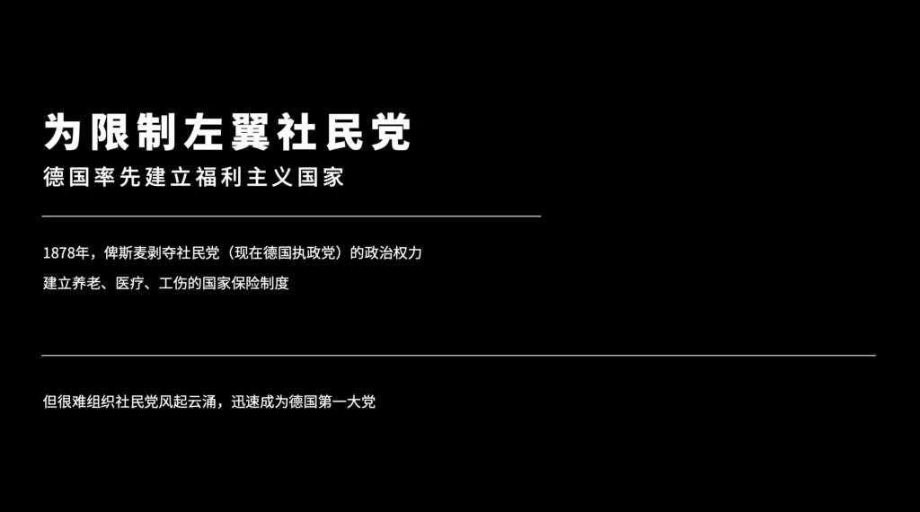 不仅要与中央党合作,俾斯麦还采取了更极端的方式,你别说当时那会儿的德国,这些党派的生命周期都蛮长的,当时被严厉打击的社民党,就是现在德国的执政党,现在德国社民党跟绿党等等联合执政嘛,就不是没有跟中央党联合执政,是一个偏左翼的政府,现在德国的社民党,就是那个时候德国的社民党,那个时候德国的社民党也非常厉害,所以就是为了限制社民党,因为社民党太强大了,就联合中央党都很难信任他们,所以1878年,俾斯麦剥夺了社民党的政治权利,发布了一个限制社民党的法令。这个法律,就规定社会主义,社会民主主义,共产主义的组织皆属于非法,他们的活动必须解散,社民党可以参选,但是不能够组织罢工,禁止他们提供宣传品,提供集会场所,他们所拒绝的城市,甚至要有戒严,这个法令一直持续到俾斯麦下台之后才被取消。但一取消之后,德国立马社民党就选赢了。但是,当时俾斯麦剥夺了社民党的政治权利,还是要去安抚城市内的工人。因此德国破天荒的在全部西欧国家第一个建立的最完善的养老、医疗和工伤的国家保险制度。所以德国就是从1778年大概到1883年这段时间,逐逐渐渐就建立了国家的养老、医疗和工伤的保险制度,成为了现代福利制度的肇始国。我们之前说英国也建立了现代福利制度,但英国的制度更不像保险制度,英国是失业保险,济贫院一系列的工作制度,包括最低工资,包括最长工资时长等等这一系列的这个工作制度是建立的,但是这种以养老啊,医疗啊,工伤为主的保险,国家的福利制度是从德国开始的。在国内,俾斯麦在非常艰难的在这些党派之间取得平衡,尤其是为什么平衡这么难,首先,我完全今天不是说要夸俾斯麦厉害,今天我们要说的就是俾斯麦这个俾斯麦主义的路线为什么几乎要失败。为什么交给威廉二世肯定弄不下去,就是在议会制里面,容克贵族是绝对少数,你要面对的第一自由党,就这些新兴的城市阶级商人,有巨大的动员力和能力。第二,中央党这种跨国的、跨阶级的党派也有巨大动力。第三,社民党处于城市核心,人数非常多,你以一个少数的方式,在议会制体制之下,希望用合纵连横的方式去限制所有人,这基本上是一个走钢丝的事情。不仅俾斯麦在国内在艰难的平衡,在国际,俾斯麦也进入了一个艰难平衡的周期。
