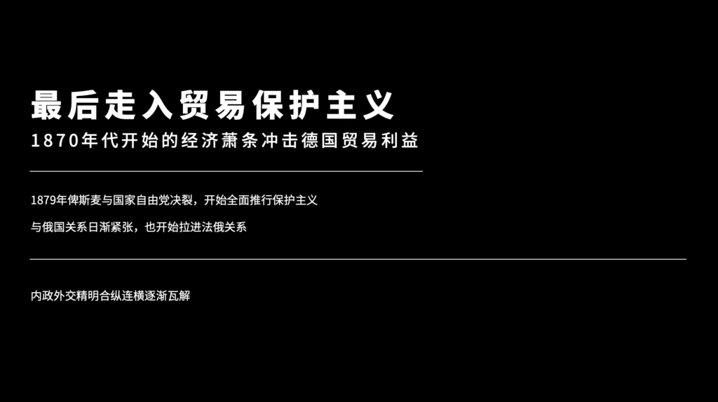 这种艰难的平衡,因为一场经济衰退双双打破,1870年开始,欧洲在战后长期,就1848年之后,长期经济发展滞后,因为经济周期的原因。终于进入了一个衰退,在这个衰退之中,过去的自由贸易对于容克贵族,主要是地主和农业阶层的利益就获得了很大的冲击,为了保护容克地主在德国不破产。德国不得不走入了贸易保护主义,就是重商主义。我们知道,打一战就是因为1871年开始各国的保护主义、重商主义,而打二战就是一战之后30年大萧条所导致的重商主义。这是为什么现在WTO、世界银行等等体系重要的原因,就我们之前讲过的。另外一个道理我们之后再讲,我们先回到1870年,1870年开始,因为新的贸易保护乳业关税法案要通过,让俾斯麦跟国家自由党决裂,就是跟这些自由主义者和商业阶层在国内决裂。开始全面推行贸易保护主义,导致很快俾斯麦输掉了议会,因为过去在议会,能够抗衡的就是类似于像中央党,国家自由党这样的,现在国家自由党决裂之后,俾斯麦的政党立马输个精光。而社民党开始逐渐做大,而这不仅导致了内部危机,还导致了外交危机,这个外交危机最关键的就是为了不让俄法联盟,因为现在你这样去跟法国谈没有任何意义,怎么可能呢?所以就是维持跟俄国的关系。但是因为贸易保护主义的危机,跟俄国的关系日渐紧张,因为俄罗斯出口到,当时的沙俄出口到德国的农产品,很大程度上就是乌克兰的小麦,占当时俄国出口额的30%,而在关税增加之后,俄国失去了一大部分对德的小麦出口。当时俄国的报复,对德国的机械和铁路装备可以双倍的进口税,反过来再一步,得罪了德国的工业界等等等等,因此在这个程度之上怎么样呢?打仗,所以说在19世纪80年代开始,俄德两国的军事争霸和战端,就逐逐渐渐紧张起来了。我不得不说,就是在俾斯麦的治下,尤其是从七一年到九零年中间的和平的时光,德国的工业有非常大规模的发展。今天我们耳熟能详的公司,像化工界的巴斯夫,然后巴夫斯还是巴斯夫,巴斯夫应该是,然后工业界的奔驰,就奔驰车,西门子,克鲁格,克鲁伯等等等等,都是在那个年代发展起来的德国企业,这些德国企业在今天都还在持续运作之中。所以当时德国的工业部门,对德国来讲举足轻重,这种为了农业阶层的贸易保护主义,冲击了工业的利益,所以这个内政外交非常精明的合作连横,在这次经济危机的冲击之下,都逐渐走向瓦解。所以我必须多说一句,就二战之后我们建立这个体制,它的特点不管在任何国家的内政外交之上,它的特点是什么呢?它的特点是稳健。这个特点就是他经得起经济危机等等问题的冲击。所以在这个局面之下,俾斯麦在国内的声望,也越来越低,大家对他的抱怨,也越来越多。