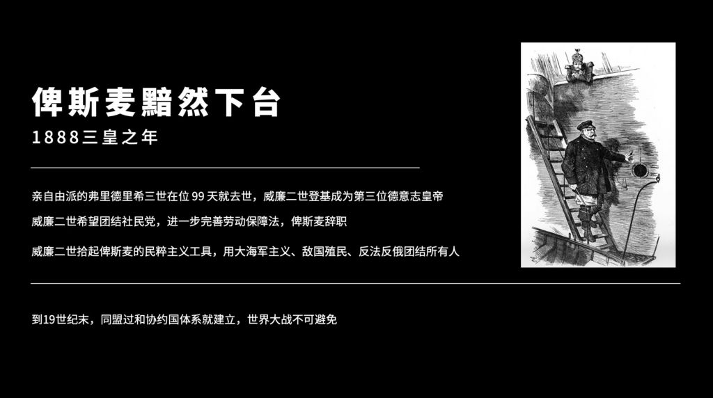 终于,迎来1888年,这一年叫三皇之年,之前就是跟俾斯麦合作无间的这位威廉一世最后逝去。他的儿子等了这么多年的亲自由派的儿子,腓特烈终于登基,他登基之后,德国的工业派,工商人士都很高兴,认为一定会导致帝国内部的自由化,而且由于这是亲英国派嘛,所以议会对于政治进程的影响,也会加剧,终于可以摆脱俾斯麦这个老狐狸了。而且,新皇帝上任之后,俾斯麦的妹夫就是非常保守的容克贵族派的内政部长被免职,昭示了当时德国的改革方向,而且对俾斯麦政府也造成了打击。但是,德国人运气是真差,这位腓特烈患有喉癌,虽然继位之后,继位之后病越来重,导致他刚刚统治了99天就撒手人寰,所以人称百日皇帝,由他的儿子威廉二世随后登基继位,但威廉二世跟他老爸的脾性可完全不同,所以德国的自由化就陷入了停滞。所以威廉二世,成为了德意志第三位皇帝,他上台之后,第一,他非常讨厌俾斯麦,认为第一,因为他的爸爸跟俾斯麦的岁数相差无几,可能还能合作,他比俾斯麦小,就觉得俾斯麦是对他很大的一个阻碍。因此,他上台就立马团结了跟俾斯麦矛盾最大的社民党,废除了俾斯麦就限制社民党的法案,并且,要进一步完善劳动法。所以这个威廉二世走的什么路子呢?很明显走的是拿破仑波拿巴的路子。最终,他逼迫俾斯麦辞职,就当时德国人就有讽刺漫画,就是领航员下船。所以威廉二世,重拾俾斯麦过去极端的民粹主义,开始推行大海军主义,帝国殖民,反法反俄的方式,迅速团结了国内的所有人,这个方式真的是有效。所以国内的不管是基督徒,自由派,商业人士,容克贵族,工人就像拿破仑波拿巴一样,迅速聚集在威廉二世的周围。因此在这个情况之下,各国的矛盾不断的加剧,到19世纪末,同盟国和协约国的体系就建立,世界大战就一步之遥了。所以说这里里面有一个非常值得争议的话题,我们之后也会坐在节目里面来跟大家细节讨论,有的人认为,第一次世界大战不是俾斯麦的责任,是威廉二世的责任,俾斯麦本身,你看俾斯麦是一个扩张意愿不强,强调欧洲协调秩序的人,如果是俾斯麦继续在位,欧洲是不会打一战的,所以责任都在威廉二世的身上。有另外一种观点认为,这个责任俾斯麦是要负很大一部分的,就是俾斯麦,有德国特色的民族主义,这个路线,导致他是一个特别难以驾驭的一个走钢丝,这种钢丝稍微行差踏错,实际上在俾斯麦的末年,就已经快速快要走向崩溃了。所以很大程度上是俾斯麦路线的问题,到底是谁的问题,这个我们之后可以讲俾斯麦的部分,再去细说。