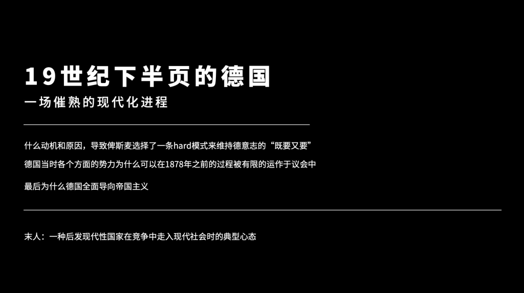 所以今天这一期,我们大概就大家就看到了我们所讲的这四个阶段,从1848年到1890年的德国,大概经历了哪些事情,里面你应该能感到很多很熟悉的东西等等等等。所以19世纪下半叶德国,就是一个催熟的现代化进程,我们之后去关注,可以从几个问题来关注,第一,到底是什么动机和原因,导致俾斯麦选择了这个模式,来维持他的这个既要又要还要的这个路径。他是怎么样走上这么一条路径的,这个是一个很值得回答的问题。第二,那俾斯麦你想这样其他人为什么配合你呢?德国当时有这么复杂的多方面的各个势力,这些势力为何在1878年之前都能够相对有效的被俾斯麦的合纵联合维持在议会体制之中,而没有陷于极大的崩溃,当时俾斯麦用了什么方法?其他的人,包括自由党,甚至包括犹太金融家,包括中央党等等等等,是为什么要跟俾斯麦进行合作的呢?第三就威廉二世,就拿破仑波拿巴这套怎么这么有用?德国为什么会轻易的全面倒向帝国主义?当时德国是因为什么原因,竟然这么快的速度就倒向了帝国主义?这真的是一个值得去回答的问题,所以当然不只是这三个问题,这三个是我现在提出来的,就大家可以,我猜有些同学对这段历史感兴趣,你们可能自己会去读一些书,和在读书的过程中,你们可以去看看的一些问题,看看你们能够得到什么样的答案。如果你要去读一些书的话,书还是很多的,包括我们之前讲的霍布斯鲍姆的书,包括你就搜普鲁士俾斯麦,都能搜到不少的书,霍布斯鲍姆就是我们之前说的年代四部曲。包括有另外一个这个世纪的演变,19世纪史都很重要,研究德意志帝国跟俾斯麦的书,是卷制浩繁,汗牛充栋,你感兴趣都可以去看一看。所以透过这些东西,我们慢慢慢慢不仅要了解德意志,了解俾斯麦,更多的,就是了解当时人的心态,因为我们最后对接尼采嘛,什么叫末人。最典型的末人就是得一种后发现代型国家在竞争中逐渐走向现代社会时,社会上那种典型的心态,我们就是要在德意志帝国的背景之下,来了解这种心态是什么,再去进入尼采的部分。今天这期大概就是这样,下期应该会比较快,我们就不用隔一周了,下周一就能开始讲,我们来讲讲俾斯麦的部分,因为我准备的差不多,那这期大概就是这些,我们看看有什么问题,如果你有问题,就可以在在微信群或者discoord上发问了。